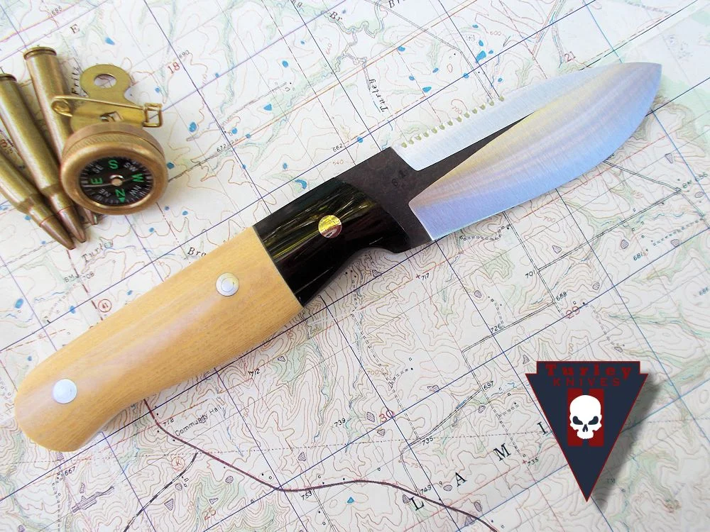 M1 Gasconade: Commando grind, spine serrations , bone linen micarta handle scales, black acrylic bolsters, stainless loveless handle bolts.