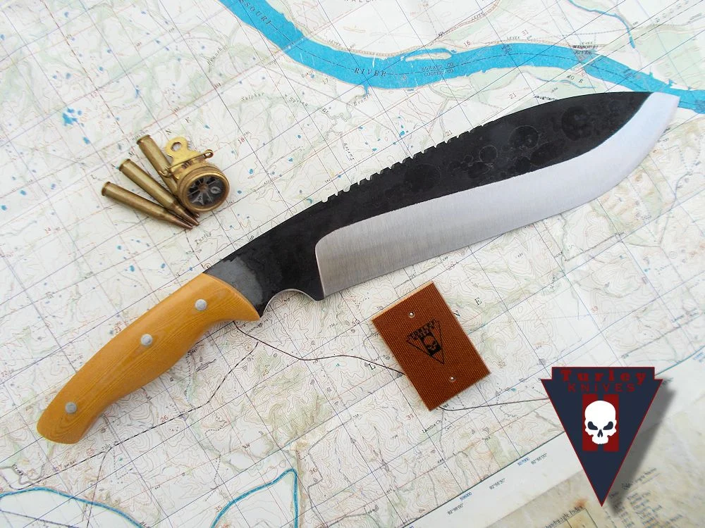 Advantages: The idea of this grind is that, for large chipping knives, it gives you lots of strength toward the tip where the chopping sweet spot is located. The part of the edge near the handle rarely gets used with large chopping knives and this grind changes that. With the near full height grind in this spot, near the front of the scales, just forward of the hand, it is possible to use it for finer work like shaving feathers for fire making or for using to carve a notch in a bow drill hearth. This grind makes a large knife twice as useful without sacrificing chopping ability and toughness.