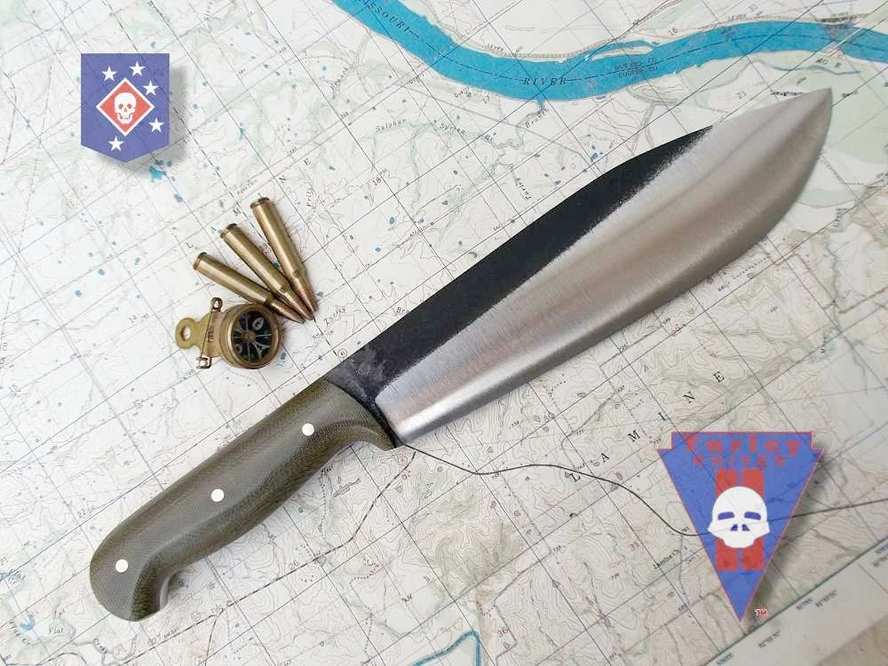 M18 Raider heavy machete, 1/4" 5160 spring steel, varied grind, od canvas micarta scales, copper pins